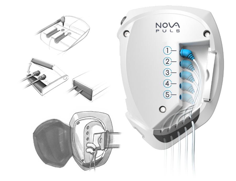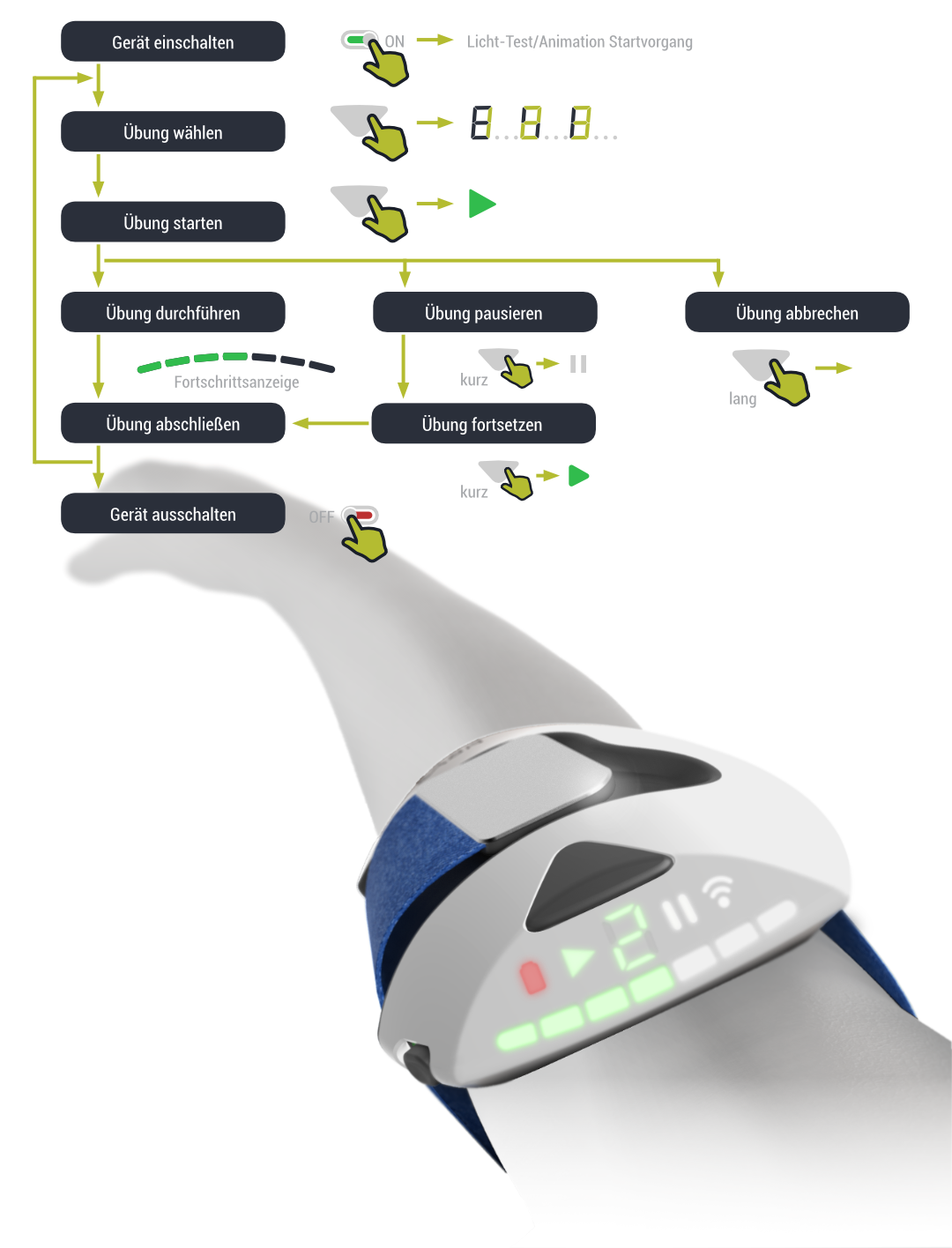 Die Funktion des Gerätes ist simpel: Entsprechend der aufgespielten Übungsprogramme werden die angeschlossenen Tapes angesteuert. Daher war es bei der Gestaltung des Interfaces naheliegend, eine Analogie zu Musikplayern (Play/Pause, Fortschrittsbalken) herzustellen. An der Oberseite der Steuerung befinden sich alle nötigen Bedien- und Anzeigeelemente, die beim Tragen gut eingesehen und erreicht werden können. Im eingeschalteten Zustand scheinen die Anzeigen durch den Kunststoff hindurch. Mit einer einzigen, mittig angeordneten Taste können Programme ausgewählt, gestartet, pausiert und beendet werden. Fortgeschrittene Nutzer:innen können erweiterte Funktionen der Steuerung über die Bluetooth Schnittstelle mit einer App nutzen.