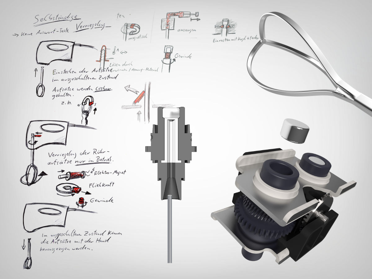 Die Rühraufsätze entwickelten wir aufgrund unserer Workshop-Erkenntnisse ebenfalls neu. Es stand die Reduktion zugunsten der Hygiene im Vordergrund. Für die Aufsätze überlegten wir uns einen Dreikant-Schaft, welcher verdrehsicher in die Aufnahme gesteckt werden kann. Dort wird er von einem starken Magneten gehalten. Die Aufsätze können einfach herausgezogen werden, eine Auswurftaste ist nicht mehr notwendig.