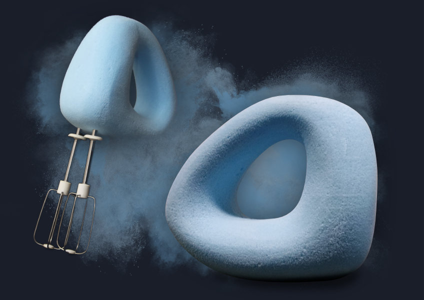 Die Grundform wollten wir möglichst unangetastet lassen. Doch wie soll man einen Kieselstein aufstellen? Wir fügten zwei Beinchen an, welche das Rührgerät nach Hinten abstützen. Zusammen mit der Aufnahme der Rühraufsätze bilden sie additiv angefügte Elemente, welche ihre Funktion deutlich anzeigen, ohne die Grundform zu brechen.