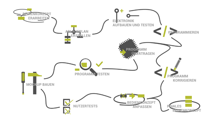 Um die Funktion der für ORBLE konzipierten Ein-Tasten-Bedienung zu testen, bauten wir ein Mockup, welches die Steuerung mit realen elektronischen Komponenten darstellt.