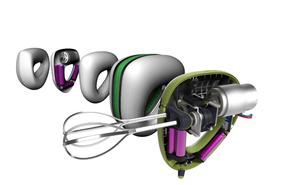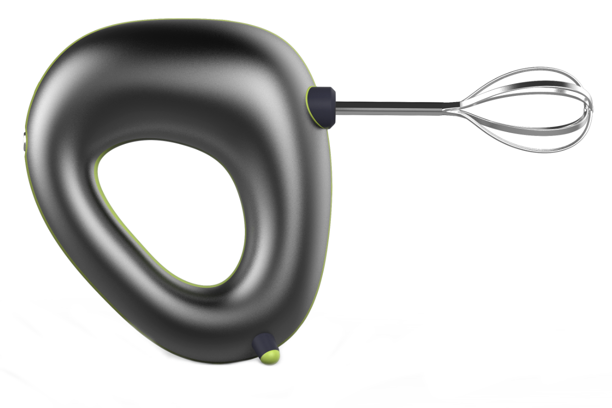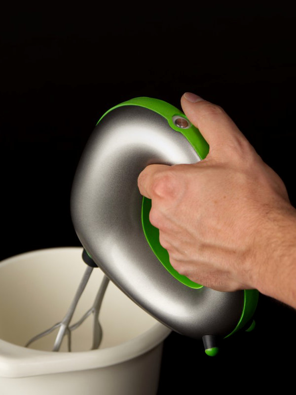 Inspiration für die Grundform unseres Handrührgerätes lieferte ein Kieselstein: Glatt, handschmeichelnd, abgerundet und keine Angriffspunkte für Verschmutzung. An einem Mockup aus Modellschaum entwickelten wir die Gehäuseform und testeten Griff- und Abstellmomente.