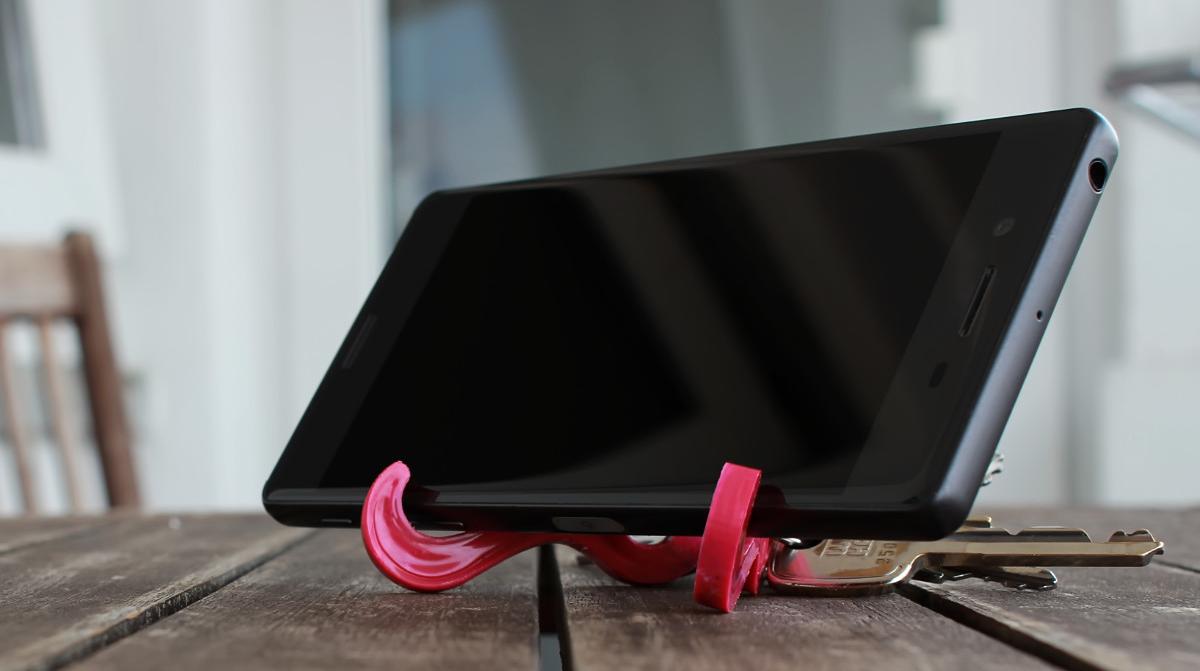 In Verbindung mit einem Schlüsselring können die Stützen gespreizt auf den Tisch gestellt werden und ein Smartphone schräg halten. Eine Immer-dabei-Lösung für Selfies, Videokonferenzen oder zum Filme schauen.