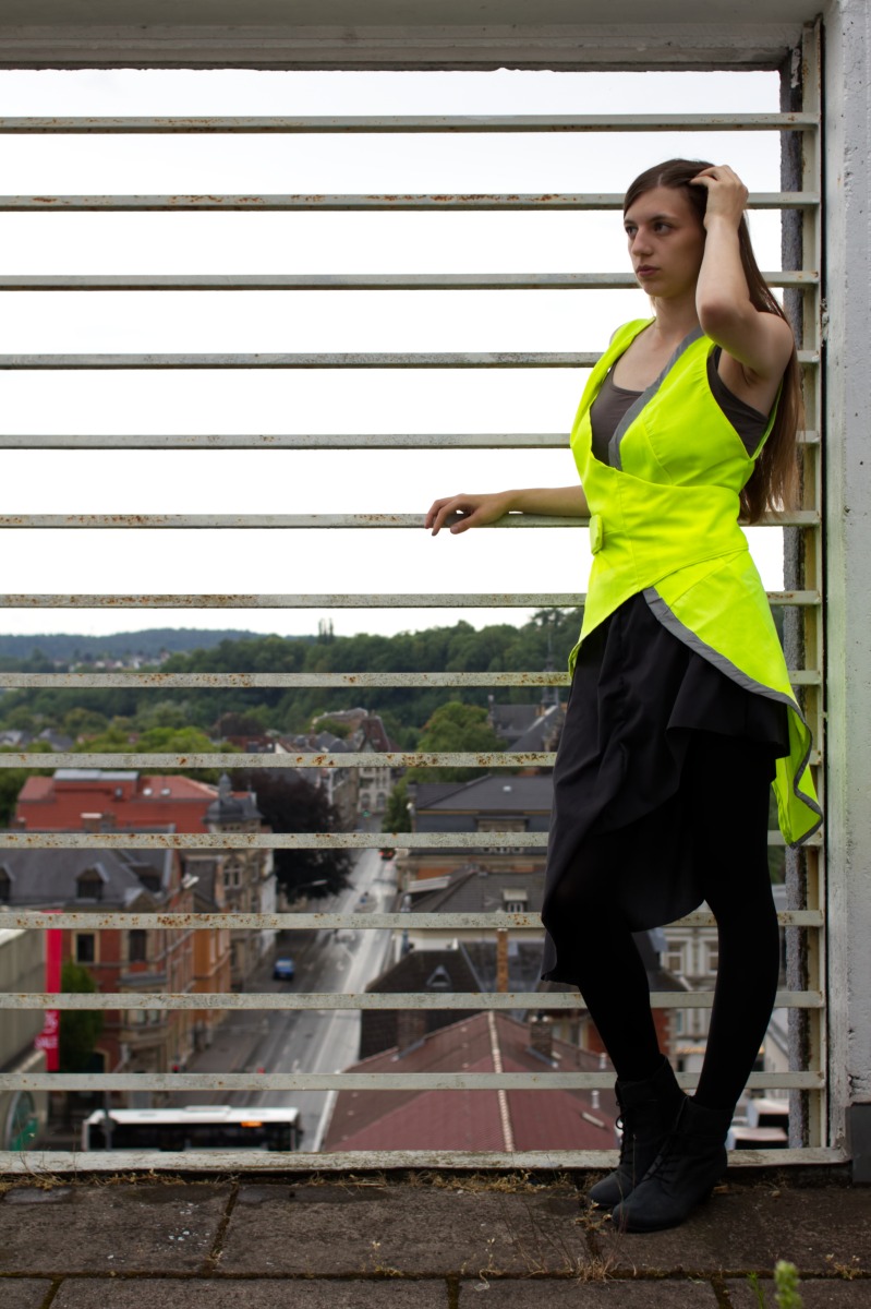 Ein "Urban Rebel" ist es nicht nur wegen seiner ungewöhnlichen Machart. Die Asymetrie und die aus seiner Tragweise entstehende Figurbetonung machen es frech und rebellisch. Ein sich verjüngender Reflektorstreifen zieht sich von unten bis über den Rücken und verleiht dem Kleid zusätzliche Dynamik.