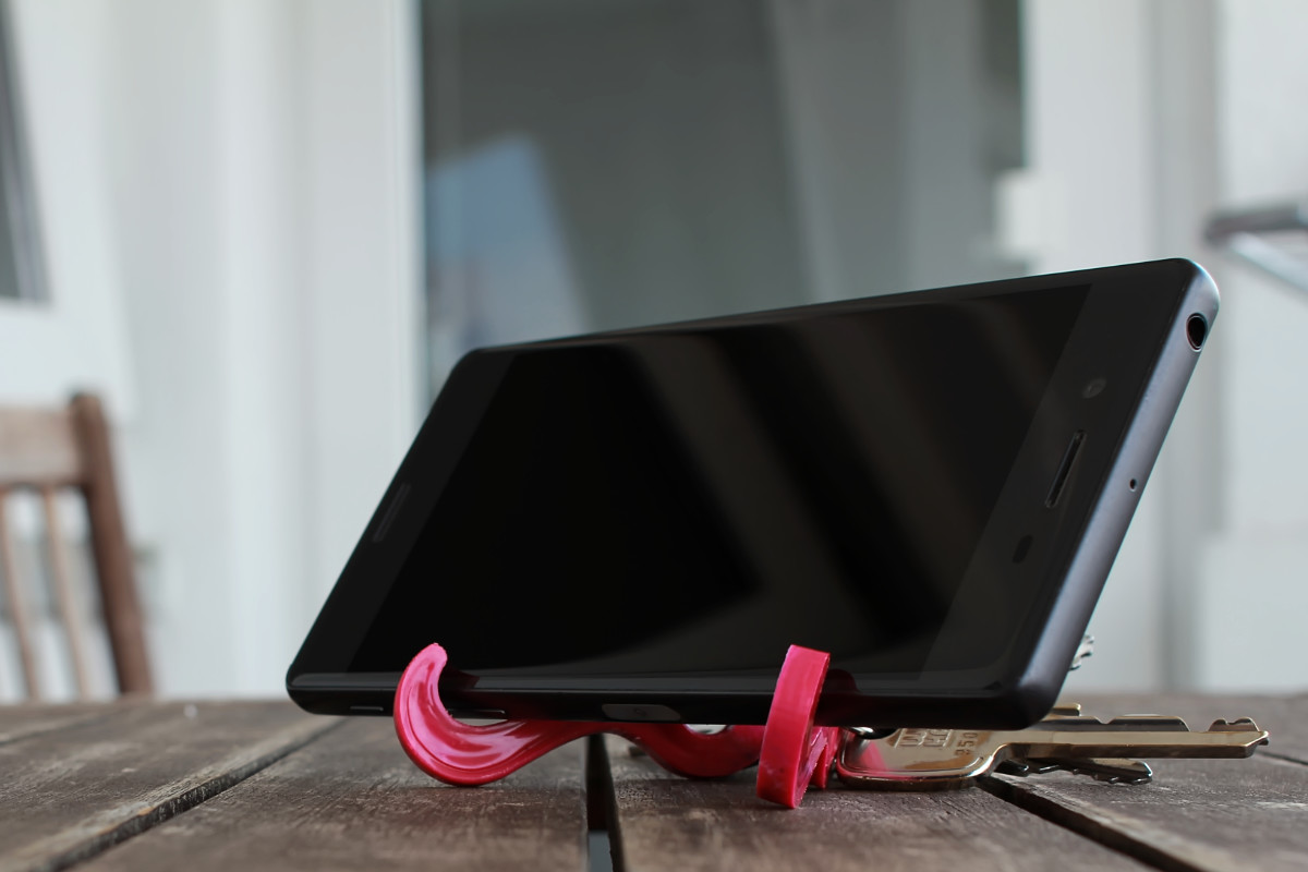 Together with an key ring, both support parts can be spread apart on a table and hold a inserted smartphone. The gadget can be used for selfies or watching videos on the way.