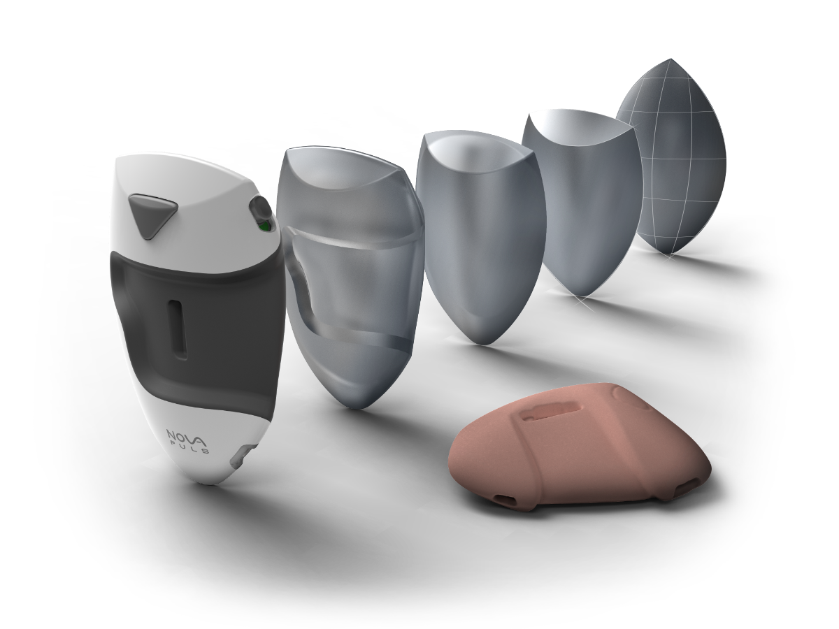 Die Steuerung wird von Patient:innen im Alltag getragen und sollte daher nicht wie ein medizinisches Gerät wirken. Daher wollten wir das Produkt neutral halten und eine Möglichkeit zur Individualisierung schaffen, um dem persönlichen Stil unterschiedlicher Nutzer:innen gerecht zu werden. Basierend auf diesen Überlegungen sowie den definierten, technischen Funktionen fertigten wir Skizzen und Entwurfszeichnungen für die Grundform der Steuerung an.