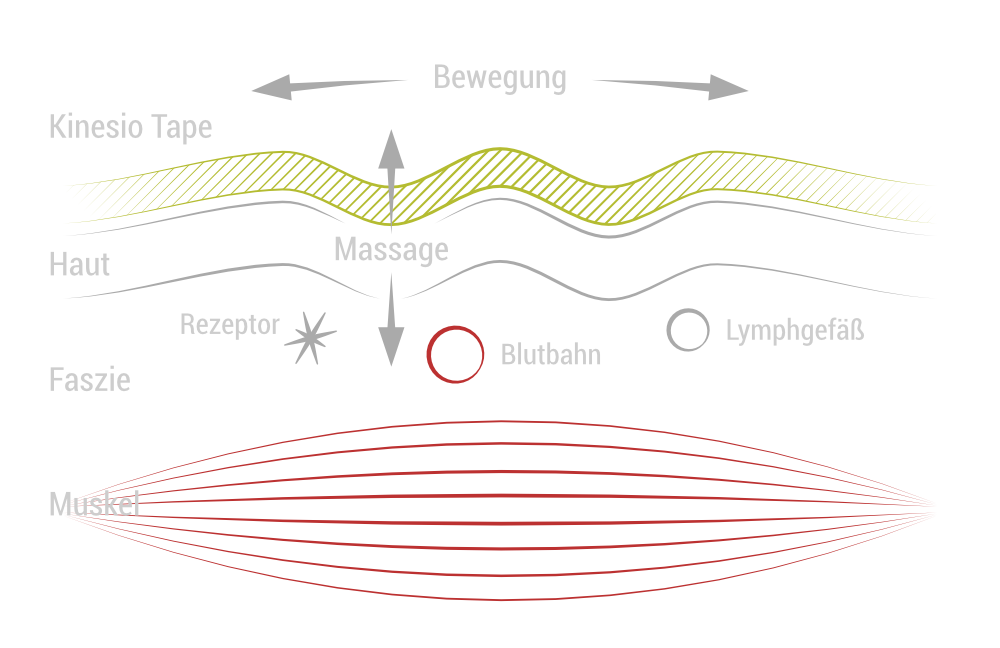 Kinesiotapes lassen sich in der Physiotherapie vielseitig bei verschiedenen Krankheits- und Überlastungsfällen anwenden. Aufgeklebt auf der Haut können sie die Durchblutung anregen, Verspannungen lösen und sogar bei Muskel-, Sehnen oder Gelenkproblemen helfen. Das korrekte Anbringen erfolgt meist durch ausgebildete Physiotherapeut:innen, danach können die zu behandelnden Personen die Tapes aber bis zu einer Woche tragen. Bei alltäglichen Bewegungsabläufen heben die elastischen Tapes die Haut und darunterliegendes Gewebe an. Durch diese Massagewirkung werden Blockierungen in den Faszien gelöst, die Blut- und Lymphzirkulation verbessert und Rezeptoren gezielt gereizt was zur Heilung und Schmerzlinderung beiträgt.