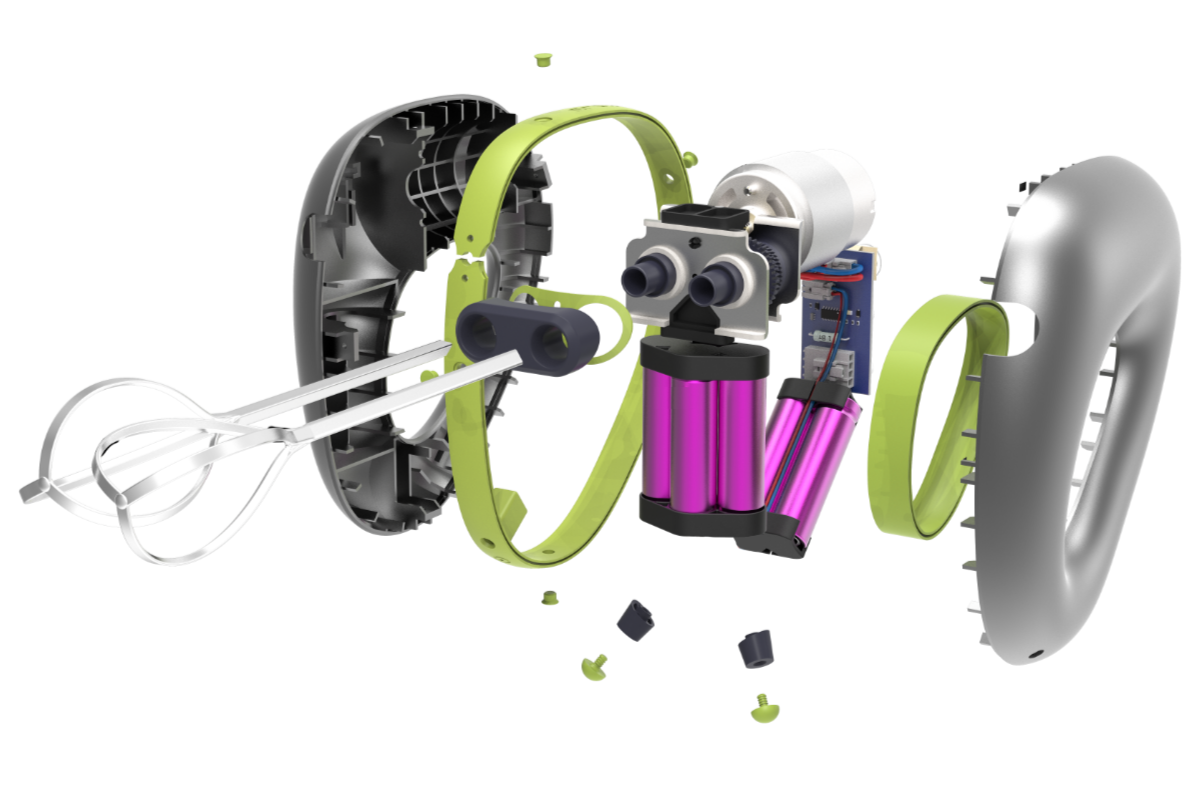 Motoren, Taster, kapazitiver Sensor, RGB-LED und Akku wurden an ein Modell aus zwei gelaserten Holzplatten montiert. Die Bauteile wurden an einem Arduino-Mikrocontroller angeschlossen, auf dem die Steuerung programmiert wurde.