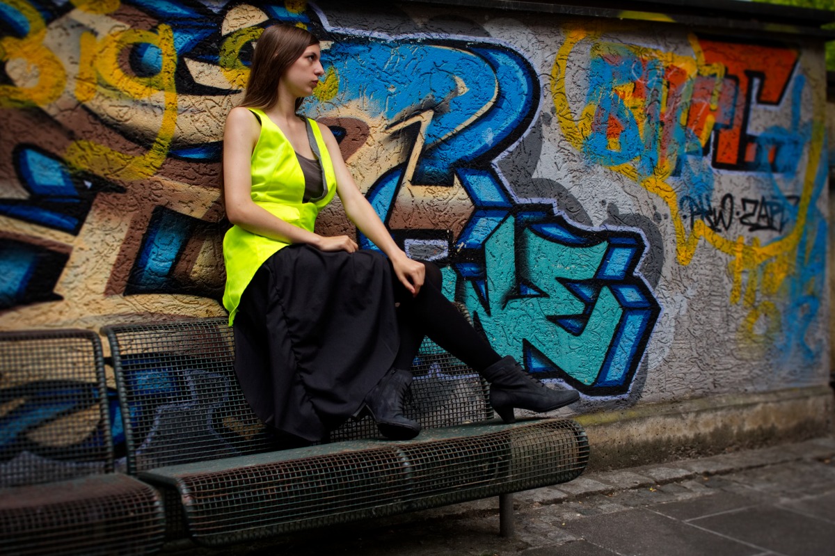 Ein "Urban Rebel" ist es nicht nur wegen seiner ungewöhnlichen Machart. Die Asymetrie und die aus seiner Tragweise entstehende Figurbetonung machen es frech und rebellisch. Ein sich verjüngender Reflektorstreifen zieht sich von unten bis über den Rücken und verleiht dem Kleid zusätzliche Dynamik.